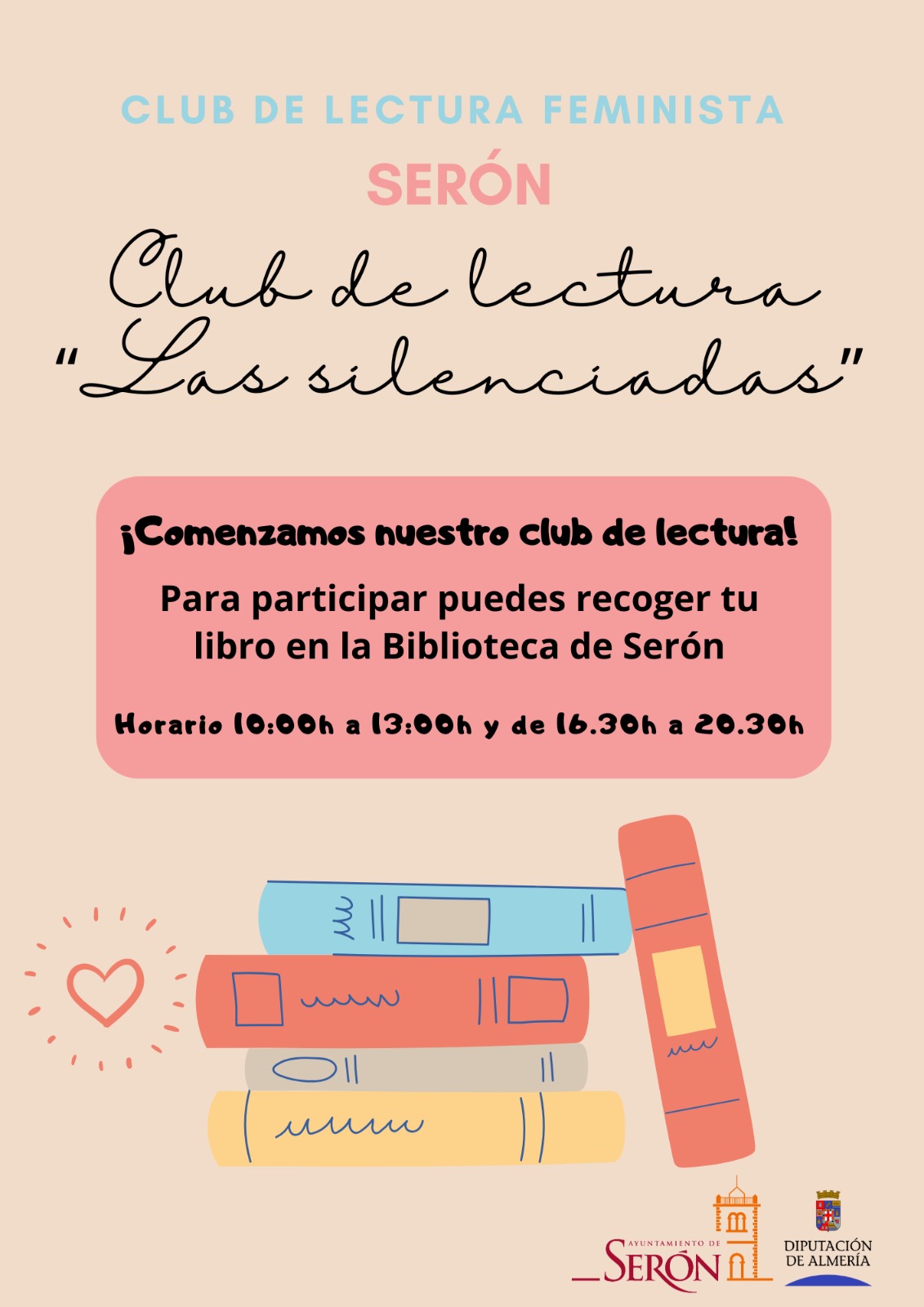 Club de Lectura Feminista “Las Silenciadas” – Serón ¡Comienza nuestro club de lectura, únete! Recoge tu libro en la Biblioteca de Serón Horario: 10:00 a 13:00 h y 16:30 a 20:30 h